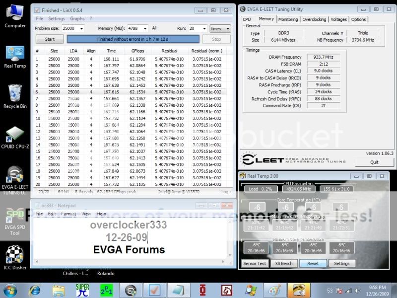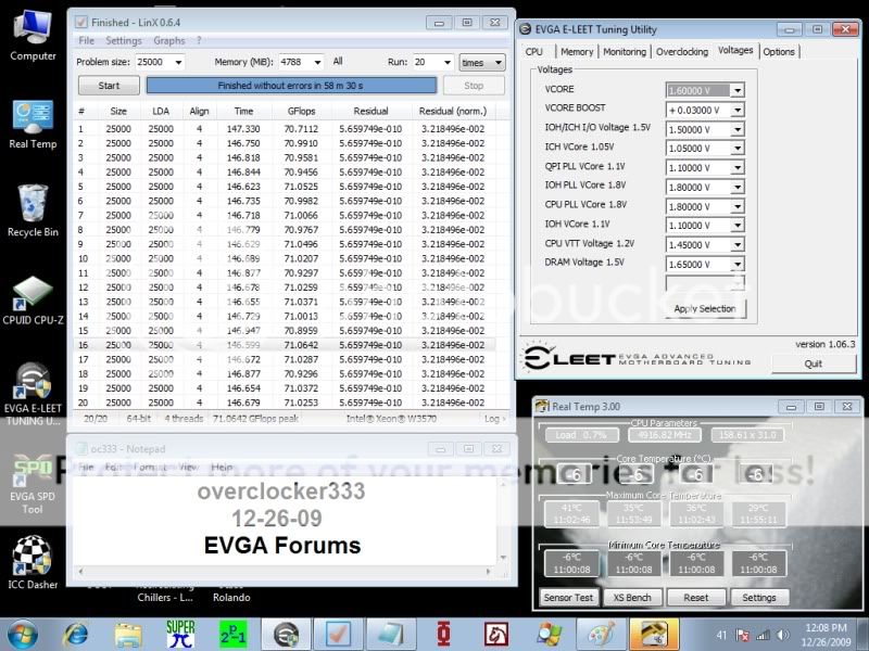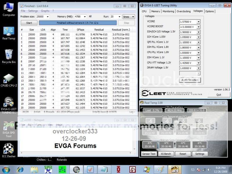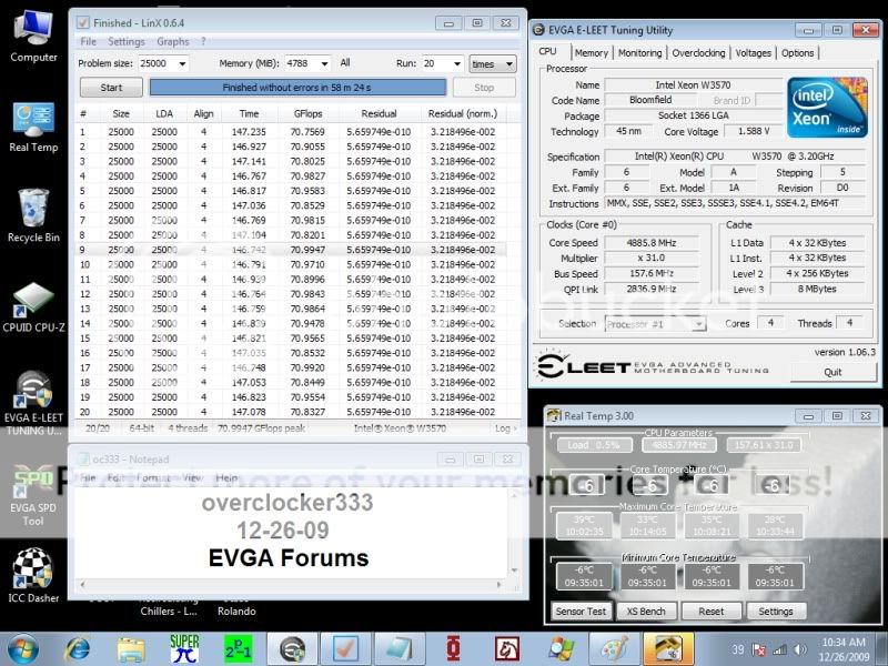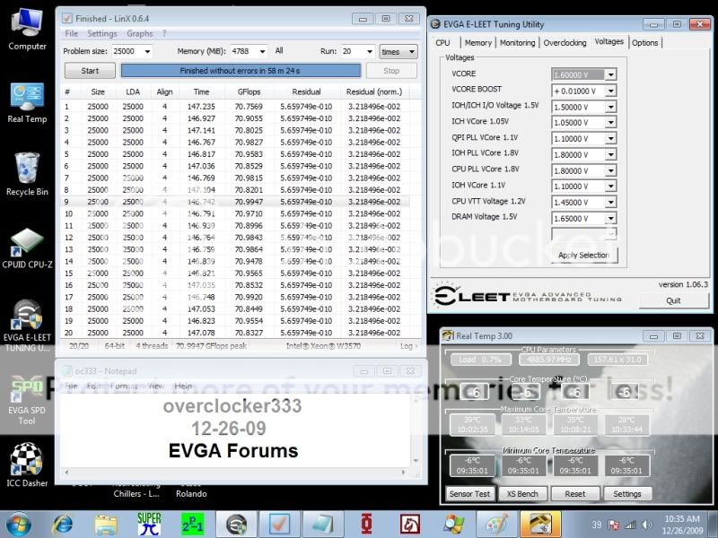 HT off... CBGPCS modified OCZ Phase Cooler Xeon W3570 Batch #: CPU clocked at: 4886 mhz Voltage: 1.61v w/Vdroop Idle temps: -6/-6/-6/-6 this is as low as Real Temp can read Load temps: 39/33/35/28 This unit is not without it's problems... I will explain in a bit... but right now I'm going to try and squeeze in a 4.9ghz run before we take the kids to exchange some of there gifts at the store madness... lol!