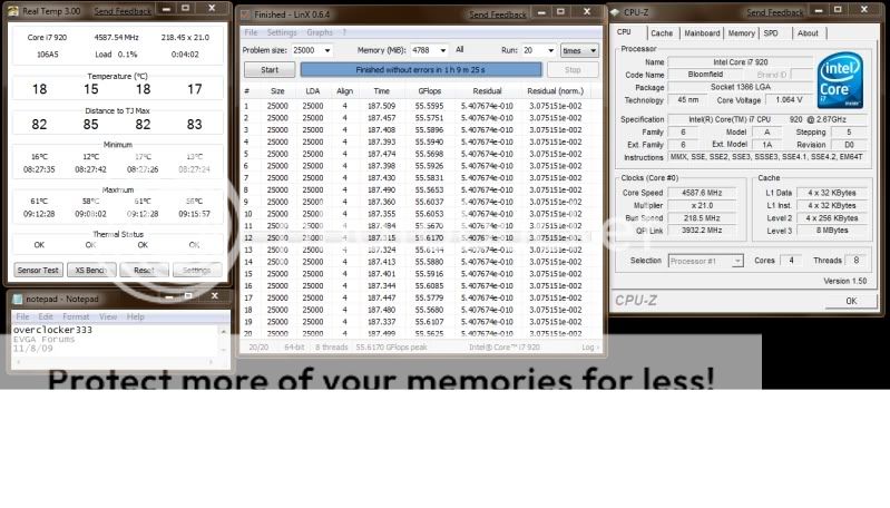 The official post: EDIT: Ah, crap! I put in the wrong month... Well, you know... Core i7 965 133.67x31 = 4143.6MHz 1.456v under load (vdroop on) Load 81, 80, 81, 79 Idle 40, 41, 40, 40 HT OFF