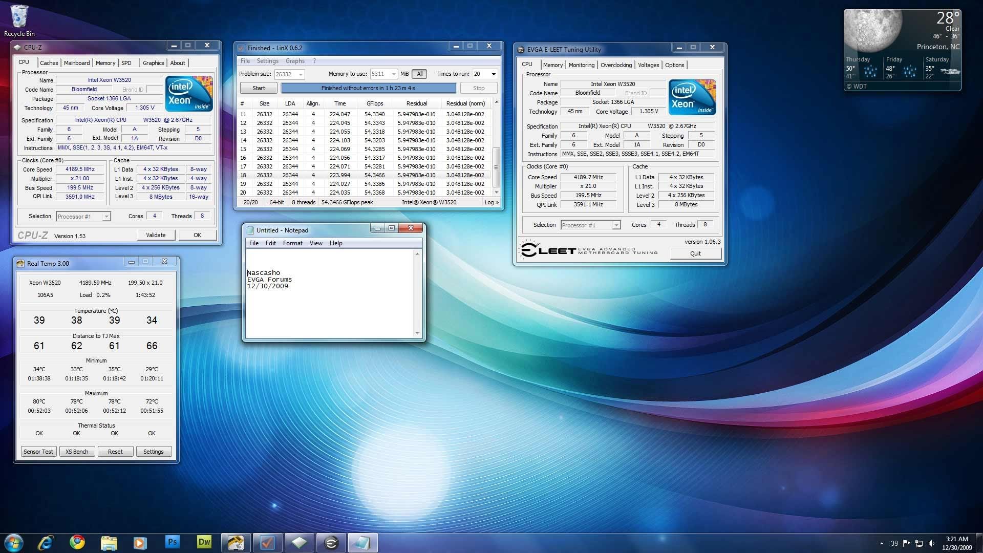 Well, I'm not very happy with these results, as I expected a LOT more out of this cpu, but at least I finally got it stable. It took a few days to get to this point, so I'm very relieved to say the least, to have some kind of decent clock at least. So far, I'm liking my 975 a LOT more than this 920, that's for sure. The 975 was a lot easier to overclock, ran cooler, and didn't use anywhere near as much voltage. Now that I have this 920 stable with a 220 BCLK, I'm going to see how it impacts my 295's in Vantage. If I don't see an improvement in gpu score, this 920 is going up for sale and I'm putting the 975 back in. Anyway, here's my second entry: Core i7 920 Batch # 3845B029 CPU clocked at: 4389.0 Voltage: 1.5000 without Vdroop Idle temps: 35,31,34,32 Load temps: 86,83,79,79