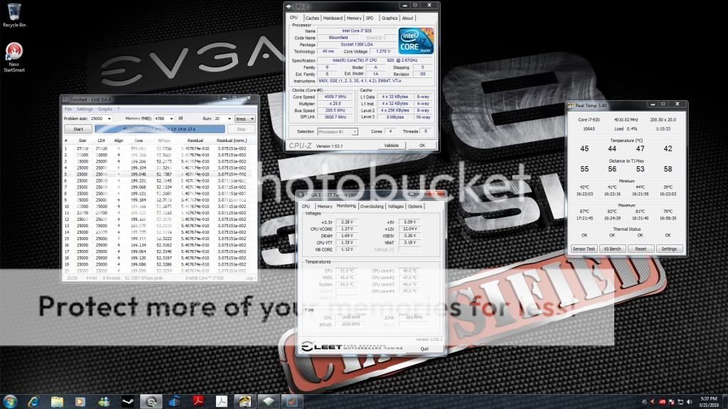 Temp still look good to me even on a sunny day in CA so I'm gonna push for more, my chip does require lot of voltage to be stable but I guess temp is what matters. Screename: iTravis Batch #: 3912B168 Core i7 920@ 4399.2 (210 x 21) Voltage: 1.49375 Idle temps: 42/38/40/37 Load temps: 78/76/72/71 HT off / 6GB RAM @ 8-8-8-24 1T
