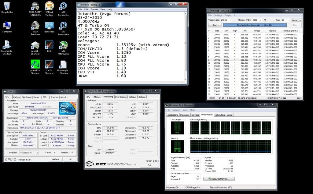 First crack at 4 GHz: Core i7 920 D0 @ 4.001GHz (191x21) Voltage: 1.35V with VDroop (1.317 under load) Idle temps: 41/41/40/38 Load temps: 80/80/75/75 HT ON 6GB RAM 8-8-8-23-70-1T