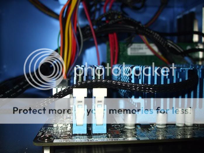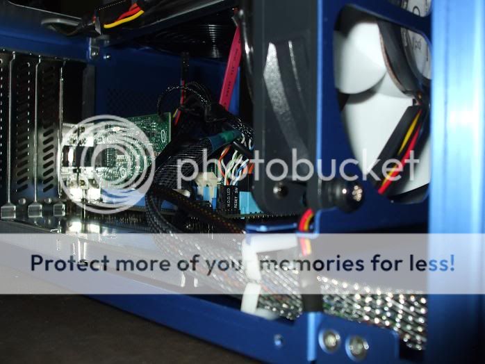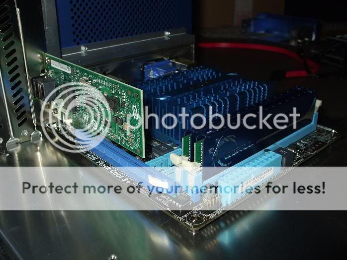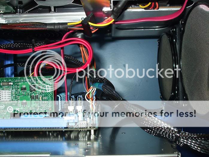Just finished adding in the modifications; I discussed in my previous post. I've also added some mini heat sinks to a few spots; to potentially offset damage caused by heavier usage. Aside from the one on the Gigabit CT Adapter's chip; I doubt any of the others, will prove very effective. I put them in anyway Back of the chassis, showing the new mesh inside the PCI brackets; and the mesh I placed over the 80mm fan intake. The inside mesh over the I/O plate; isn't really visible here. One of my Heatsinks up front, and a nice look at the RAM. The mesh installed; no more easy airflow there The Thermal sensor from the 120mm push fan; which is plugged into the CPU fan header; the other 120mm being plugged into the power fan header.