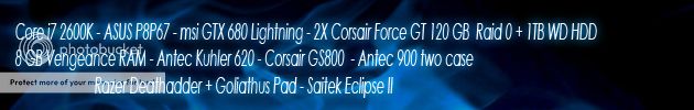 Case: Corsair Carbide 500R Black | Mobo: Asrock Z77 extreme4 | CPU: Intel i5 3570K with H100 @ 4.6GHz | Memory: G.Skill Ripjaws X DDR3 2x4GB 2184MHz CAS11 1.5v | Graphics Card: GTX780 DCUII OC @ 1260MHz | SSD: Kingston HiperX 3K 240GB | PSU: EVGA SuperNOVA G2 1000W | Hard Drives: Samsung HD501LJ [500GB] + MAXTOR200 | Sound Speakers: Creative Inspire T3100 | Mouse: Logitech G9 Gaming Mouse | Monitor: QNIX Evolution II 27" 2560x1440 @110Hz | Windows: 8.1 x64