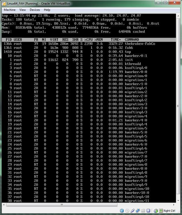 My test findings you quoted above was with the Linux64_FAH-1.5.0.7z image. If you open System Monitor in Mint on the Processes tab then start folding you will notice 17 core a5 processes loaded that will turn into one once you see "Turning on Dynamic Load Balancing" in the terminal. Not sure why it shows one more core than you actually have before "Turning on Dynamic Load Balancing" kicks in. I've tried to change priorities & affinity but it will not allow those to be changed. You may can try -smp 17 or 18 but I think this would hurt more than help. I kind of tested this with my 980x using -smp with more cores than the CPU actually has and it seem to hurt the TPF. Edit: personally I would stick to a terminal shell since this is a VBox in W7 no real since in having a GUI in VBox since you can do what ever else you need to in W7. I think the GUI shell is the cause of the problem.