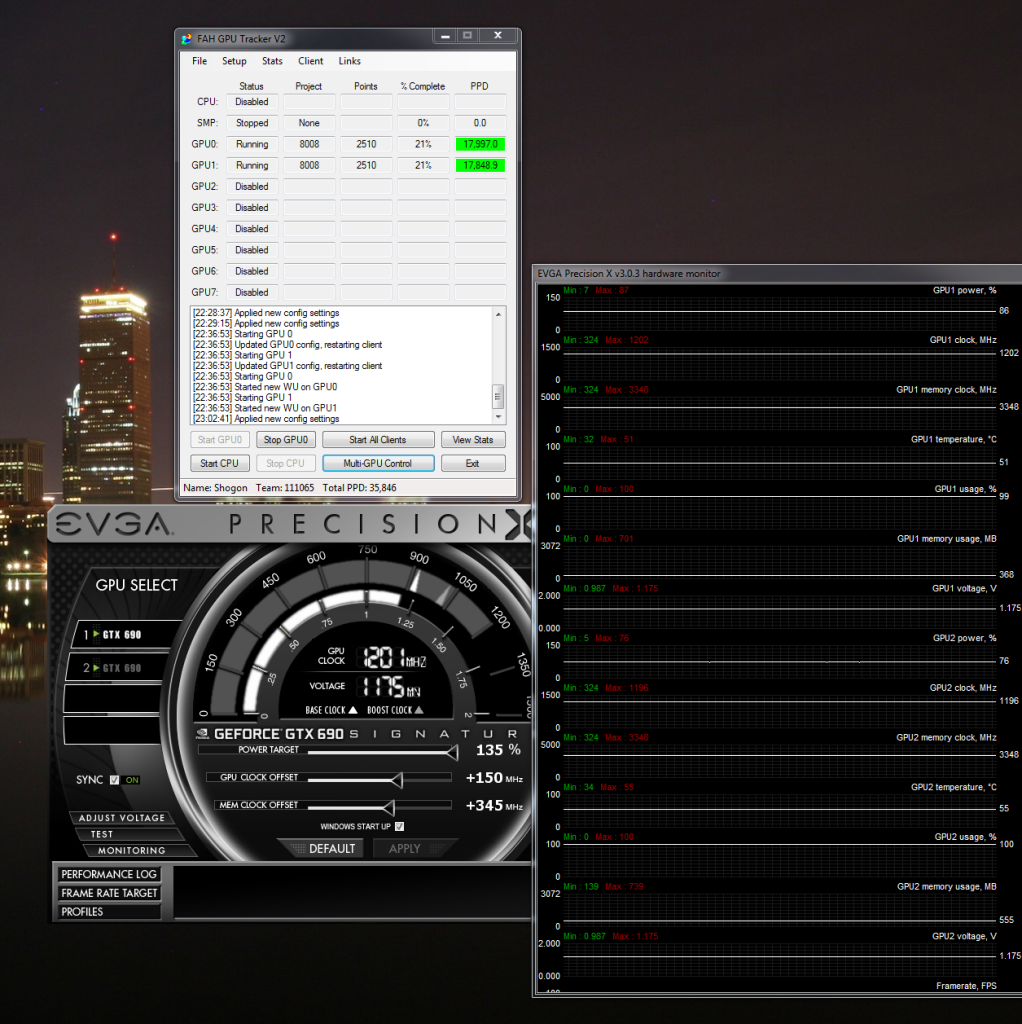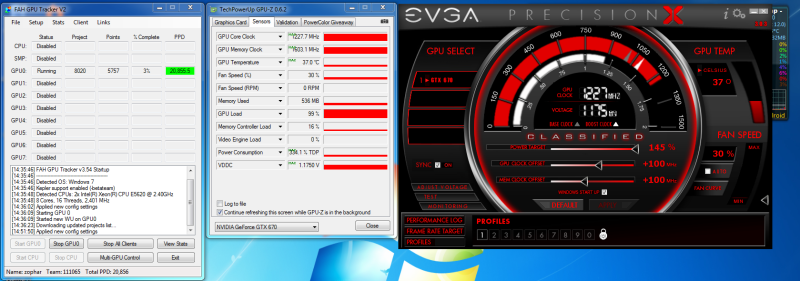 rjohnson11 Made no difference in PPD stopping the other two cards Afterburner rjohnson11 Just wanted to show off my results. I have in my primary slot a GTX 680, slot 2 a GTX 670SC, and slot 3 a GTX 580: And now.... Stop the other two and run just the 680 and what your PPD jump to 17k+ That is great news! That means it is my system and fixable. That said, sorry to hear it stayed at 14k and did not go to 17-20K... My 680 (Either) runs in the 17k-20k on those 8009's and 8010's... Are you running SLI?