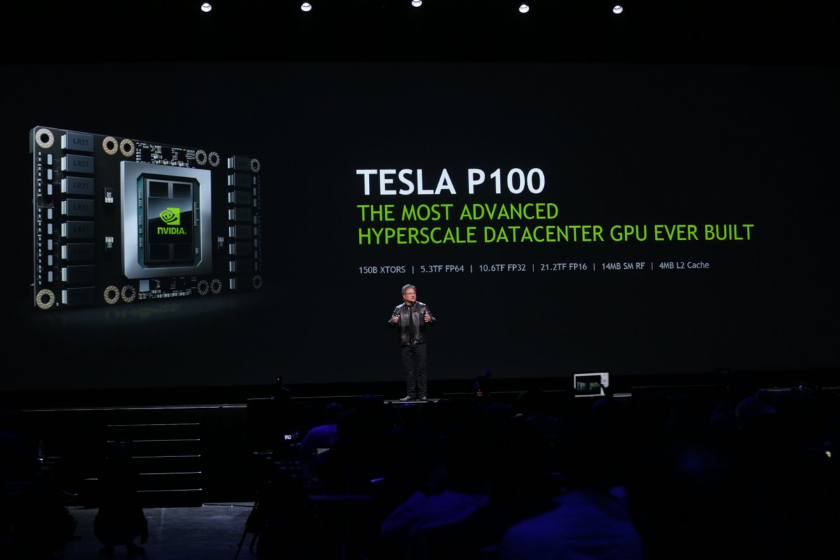 Tesla p100 150B transistors 5.3TF fp64 10.6TF FP32 21.2TF FP16