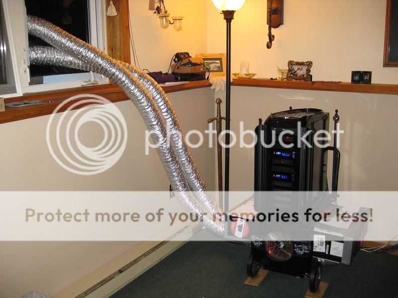 Hello Iride4u , (i'm the buddy  ) I built a crude system just to see what would happen , Nothing like what you have done there .... Very Clean and tidy  Do you have water temp sensors in your machine ?? If so how low are you going with the water temps ? As you can see I don't have a window as close to my system as you do  my 2 quad rads draw air in and it's exhausted out the front with a 220 mm fan also the bottom and back of my wagon are open. I started to get concerned when the dryer vents started sweating ( nothing dripping just visibly wet ) Do you get sweat on the vents coming in from outside ?? This is my best 3D Mark score to date on tri sli 470sc's http://3dmark.com/3dm11/2684763