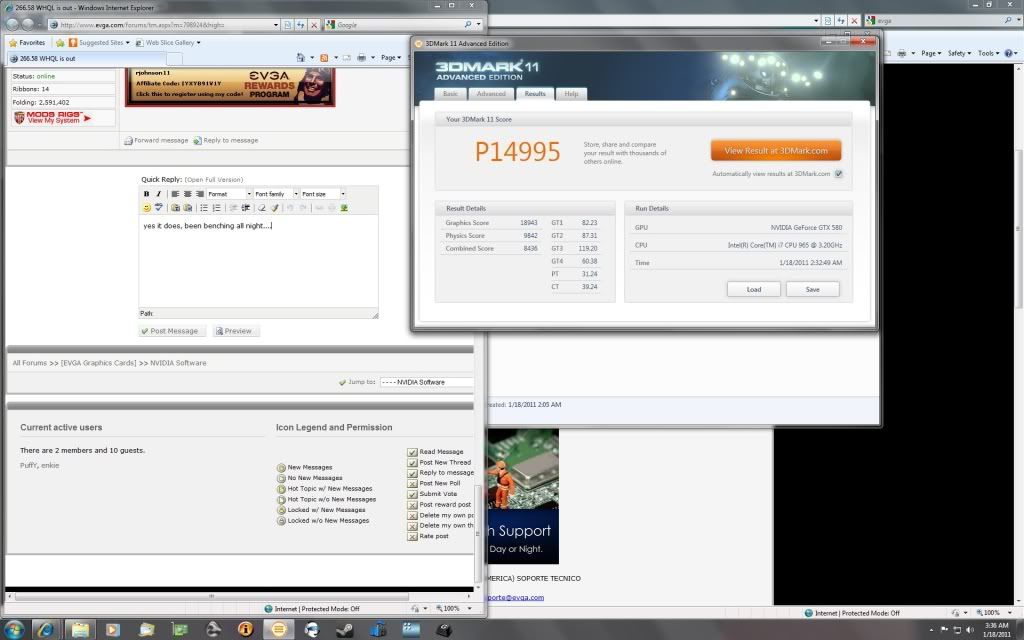 3DMark11 on new 2600K ericc191------------------- i7 2600K @ 4.5 ------------ (1) 580-- 1880/2225 ----------- 6626 -- 10267 -- 6452 --- P6978 Air http://3dmark.com/3dm11/414609 I found my max OC for the 580.. next up 5GHz on the cpu.