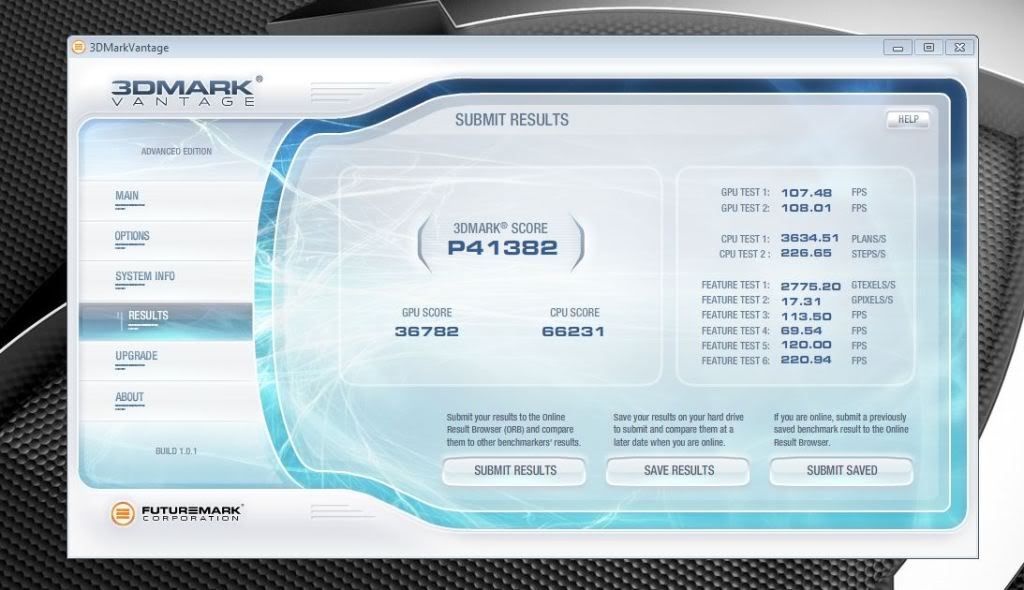 Please update (delete previous if you like) ..able to push things a tad further ;) rjbarker --------------- i7 920@ 4.23 Ghz -------- (2) 480....1700 / 2025---------36,782 --- 66,231 --- P41,382 --- Air http://service.futuremark.com/compare?3dmv=2229954