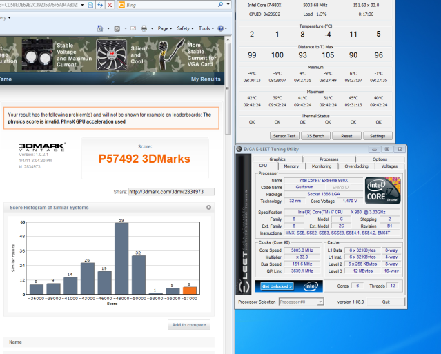 EleSSaR ------------------- i7 980x @ 5.0 ------- (3) 480SC 1860/2180 ---- 51,073 --- 92,287 --- P57,492 Water http://3dmark.com/3dmv/2834973 Not to bad getting the hang of this new cpu, able to push it on up to 5ghz on 1.47 vcore this morning.