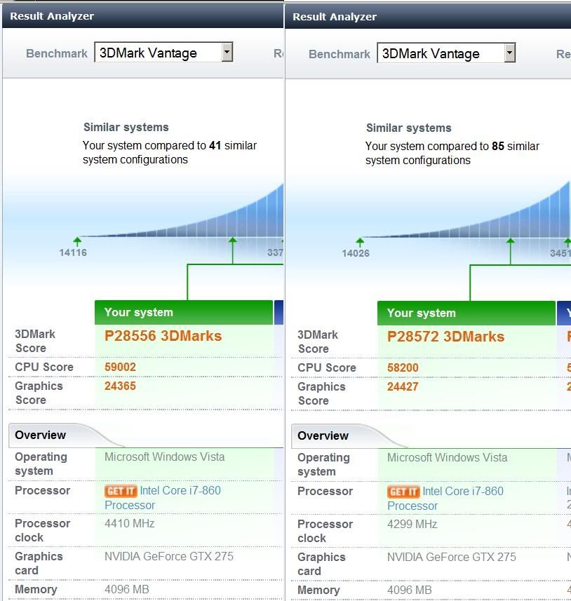 Ok, so after sleeping on it here is my current choices for where to go next. If it isn't obvious by my active posting in this thread, I love the hell out of benchmarking/overclocking just for the sake of doing it. When I'm gaming everything is backed down to 4.2 ghz/2100 mhz ram and 745/1525/1225. I'm mildly irritated that I can't seem to break that last score I posted despite 9 hours of work on the task and Bradnob, per your request, I did everything under the sun to get even 5 more clocks out of my 275's core clock. It's just not going to happen and it isn't a heat issue, they never crest 55 degrees under load, I just don't think the chips have it in them to go any higher. Hell even bumping to 761 results in a nvdklmmn crash 5 seconds out of the gate in Jane. :( So I'm faced with a dilemma - don't benchmark anymore (not an option, see above) or upgrade a component this weekend to unlock more headroom (now that's more like it). The question I have for you guys is where should I go next to try to raise this score. 1. I can jump over to a p55 classified board in 3 days (paycheck arrival + shipping) and see if that doesn't free up more wiggle room by proxy of being more stable under overclocks. The bonus to this option is that I unlock triple SLI ability for myself and that is a huge amount of head room. 3rd card would become by main vga card (275-co-op) and I'd push that sucker as far as I could. The double gpu graphics cards make me nervous though because I'm not sure how well they overclock and by well I mean can they get their cores to 760 etc. 2. Upgrade my i7 860 to an 870 and pray that the above results with higher cpu clocks don't hold true. I'm partial to this if only for the instant gratification of running to microcenter and buying the chip to get started the moment my paycheck deposits to my account, yet I'm hesitant because I really don't know how much more performance the 870 gives...and it's a five hundred some odd dollar investment. 3. Throw in the towel and order 1 GTX 285 Classified and just wait out SLI later while I push that card beyond where it's supposed to go. This sounds fun just because I actually have the 1700 watts of power in my case to support this venture and the cards power hungry 3x6 pcie cable attachments. This unlocks unhealthy tendencies in me though, since I become fascinated with "what if's." (e.g. "If I give a 2 SLI 285 classified dedicated 1300 watts of power, I wonder if I can jump over the top of the 295 boys.") :D Anyone have some input here? I'm leaning toward the 285 classified solution, but that's partially because I'm being lazy and don't want to take Hatter apart again. It's my first personally built computer and I just recently shifted cases, it's not easy doing cable management for 9 ultra kaze fans, dimm fans, my cooling tunnel (soon to be patended btw :D), and all the rest of the normal cable management. Not to mention the Thermaltake Express VGA PSU has a god damn AC power cord running through one of my PCI slots on the back of the computer.