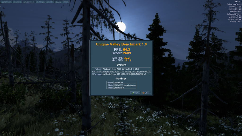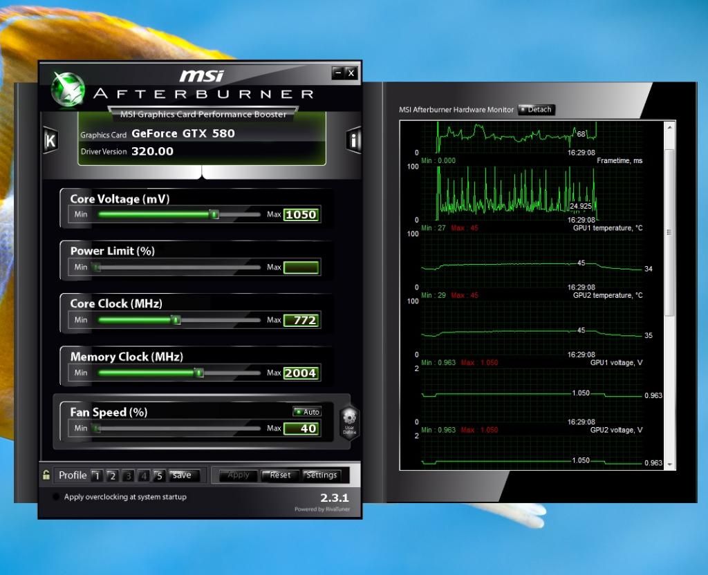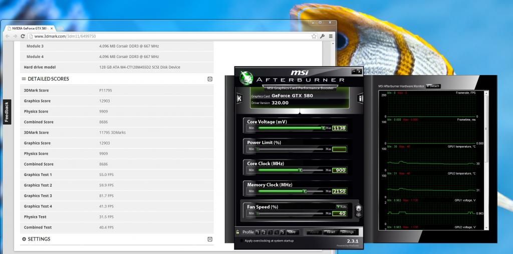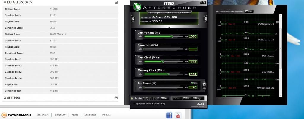 Here are some results at stock clocks on my GPU. The processor is overclocked to 4.4ghz. Listed below are the two 580's and some specs I found in AB: EVGA Vanilla - - 1.050v - 772/2004- max 1.138v Zotac Amp - 1.000v - 815/2050 - max 1.115v All test are done with cards "synced" in Afterbruner 2.3.1 Valley Benchmark Results: Valley Benchmark Temps: 3dMark 11 Results and Temps: Max GPU temps- 45c both tests 3dMark score: P10980 3dMark11 w/ stock CPU clock + GPU overclock: Max temp GPU: 46C Clock speeds: 900/2150 @ 1.138v Score: P11795 UPDATE: I gamed for about an hour now and it just crashed on me with the voltage bump on the cards (1.063v w/ stock clocks)..... Problem signature: Problem Event Name: APPCRASH Application Name: bf3.exe Application Version: 1.6.0.0 Application Timestamp: 511c9356 Fault Module Name: nvwgf2um.dll Fault Module Version: 9.18.13.2000 Fault Module Timestamp: 51709abd Exception Code: c0000005 Exception Offset: 005a7f3c OS Version: 6.1.7601.2.1.0.256.28 Locale ID: 1033 Additional Information 1: 0a9e Additional Information 2: 0a9e372d3b4ad19135b953a78882e789 Additional Information 3: 0a9e Additional Information 4: 0a9e372d3b4ad19135b953a78882e789 Read our privacy statement online: If the online privacy statement is not available, please read our privacy statement offline: C:\Windows\system32\en-US\erofflps.txt