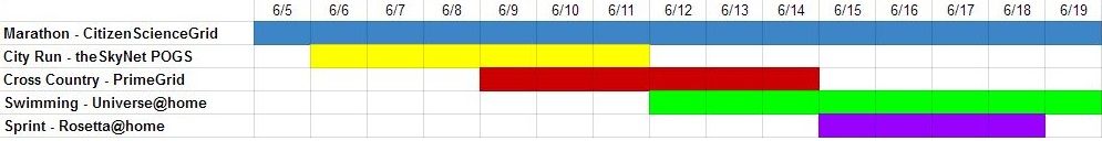 June 5th to June 19th. Just a few days away. Marathon (Citizen Science Grid)The discipline Marathon is held between 06/05/2016 00:00:00 (UTC) and 06/19/2016 00:00:00 (UTC) at the project Citizen Science Grid. These statistics are updated on the hour. Last update: Waiting for initial update. Credits that are granted now will not be counted. Current server time: 05/31/2016 07:10:22 (UTC). Are we still doing this?