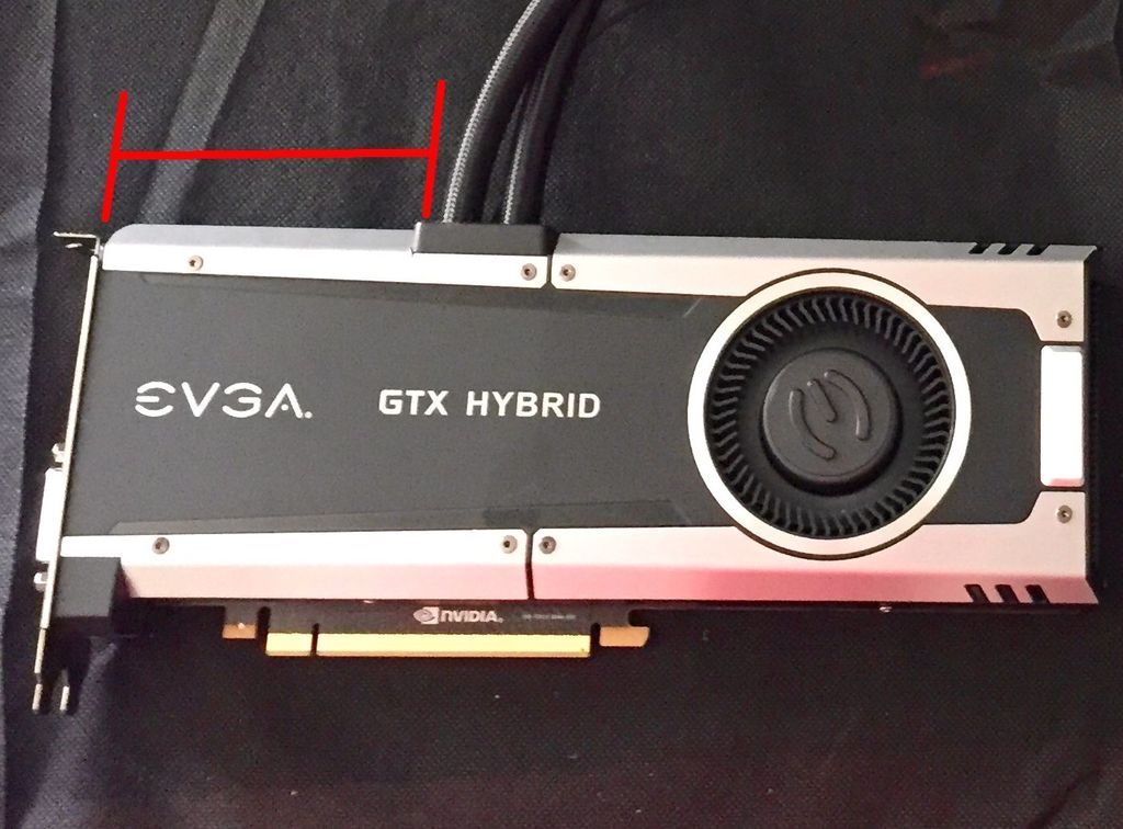 And I was hopping if one of the very kind forum members who have a Hybrid Cooler would be willing to pull off one of their side panels and measure the distance from the left hose to the left side end of the card. Like this: